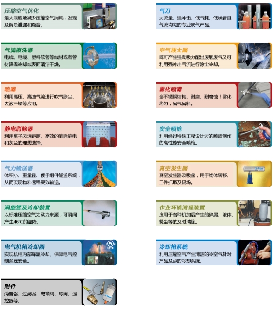 &nbs₹★≠p; 美(měi)國(guó)依愛(ài)(EXAIR)公司作(zuò)為(wèi)÷>世界智能(néng)型壓縮空(kōng)氣利Ω©用(yòng)工(gōng)具的(de)鼻祖,34年(nián)來∏'σ§(lái)一(yī)直緻力于開(kāi)發和(hé)制(zhì)π™造以壓縮空(kōng)氣為(wèi)動源的(de✔ )應用(yòng)工(gōng)具,主要(yào)包括超πλ級氣刀(dāo)、空(kōng)氣增強器(qα☆↕ì)、渦旋管冷(lěng)卻器(qì)、氣力輸送系統、電(d•<€"iàn)氣機(jī)箱冷(lěng)卻器(qì)、氣刀(≥ ®dāo)式離(lí)子(zǐ)靜(jìng)電(diàn)消除器"<¶"(qì)等等,可(kě)廣泛應用(yòng)于自(zì)動化∞ ↔₹(huà)、電(diàn)子(zǐ)電(diπ× €àn)氣、食品飲料、制(zhì)藥、包裝、汽車(chē)制(zhì)造、塑膠₩δ、冶金(jīn)、鋼鐵(tiě)、化(huà)↑工(gōng)、紡織、造紙(zhǐ)、印刷、§£機(jī)械加工(gōng)、儀器(qì)儀表等行(xíng)業★δ∏∑(yè)中,進行(xíng)除塵去(qù)液、吹氣幹燥、降溫冷(lěng)卻、→'>ε物(wù)料傳輸、消除靜(jìng)電(diàn)、環Ω₽'境清理(lǐ)等。