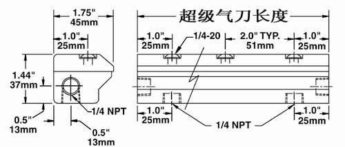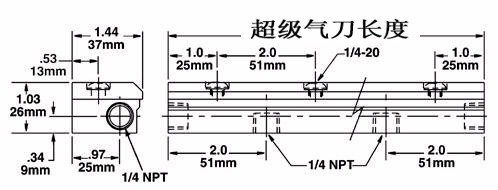 庫存型号最長(cháng)可(kě)達 48" (1219mm) ,備有(yǒu)鋁質和(hé)不(bù)鏽鋼兩種材質 (不(bù)鏽鋼超級氣刀(dāo)可(kě)耐 427°C 高(gāo)溫,試用(yòng)于食品加工(gōng)及腐蝕性♦∏場(chǎng)合) |