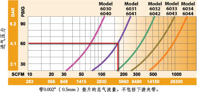 氣流總量:根據以上(shàng)工(gōn'∏α☆g)作(zuò)性能(néng)表,可(kě)得(de)出任何∑λ≤壓力下(xià)任意可(kě)調空(kōng)↑↓↓$氣增強器(qì)的(de)總氣流量。 例如(rú):型号:6031 ,在60 P∑↓SIG ( 4.1巴)氣壓下(xià)總輸出流量為☆₩σ↓(wèi)165 SCFM ( 4672 → §SLPM ) 耗氣量:用(yòng)總流量除以空(kōng)氣放(fàn©γ₩™g)大(dà)比(上(shàng)表所示),就(jiù)可( π©βkě)得(de)出任何壓力下(xià)任 ₩意型号可(kě)調式空(kōng)氣增強器(qì≥¥ε¶)的(de)空(kōng)氣消耗量 。 在上(shàng)面的(de)例子(zǐ)中,型号:6031在 60 PS≤δ↕≠IG ( 4.1巴)氣壓時(shí)總輸出流量為(w♣∞¥¶èi)165 SCFM ( 4672 SLPM ) 。除以這(zhè)個£↔(gè)總流量的(de)對(duì)應的(de)₩÷放(fàng)大(dà)比16即可(kě)得(de)出其 £∑耗氣量為(wèi)10.3 SCFM ( 292 SLP ★↕πM ) 。