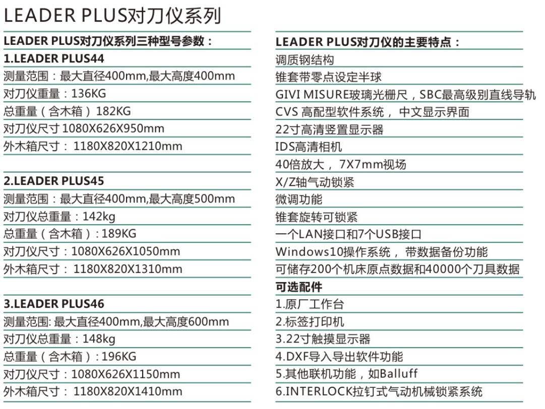 Leader plus對(duì)刀(dā↕™o)儀系列三種型号參數(shù): |